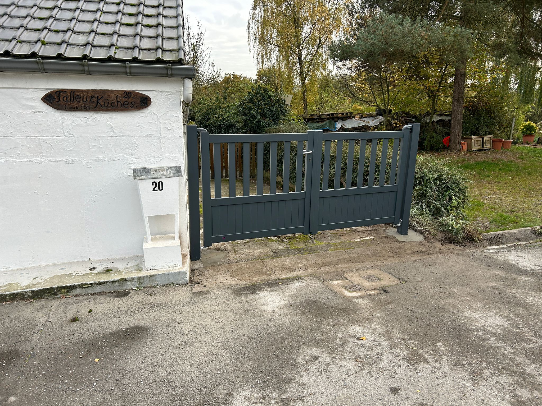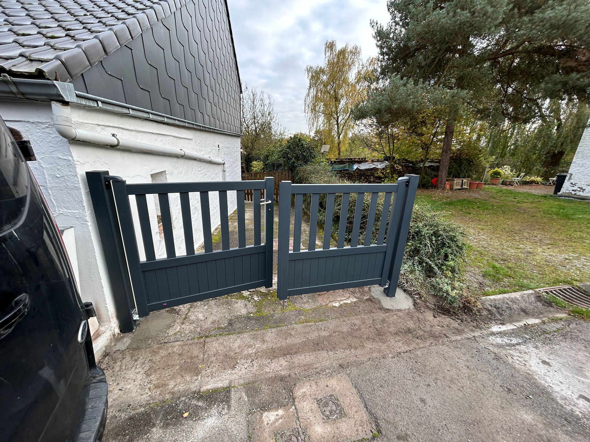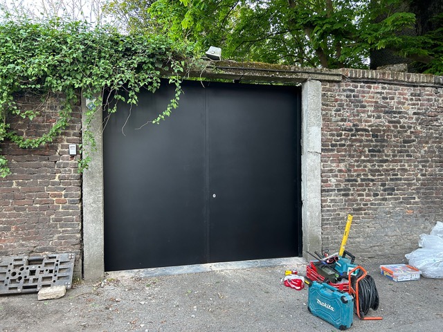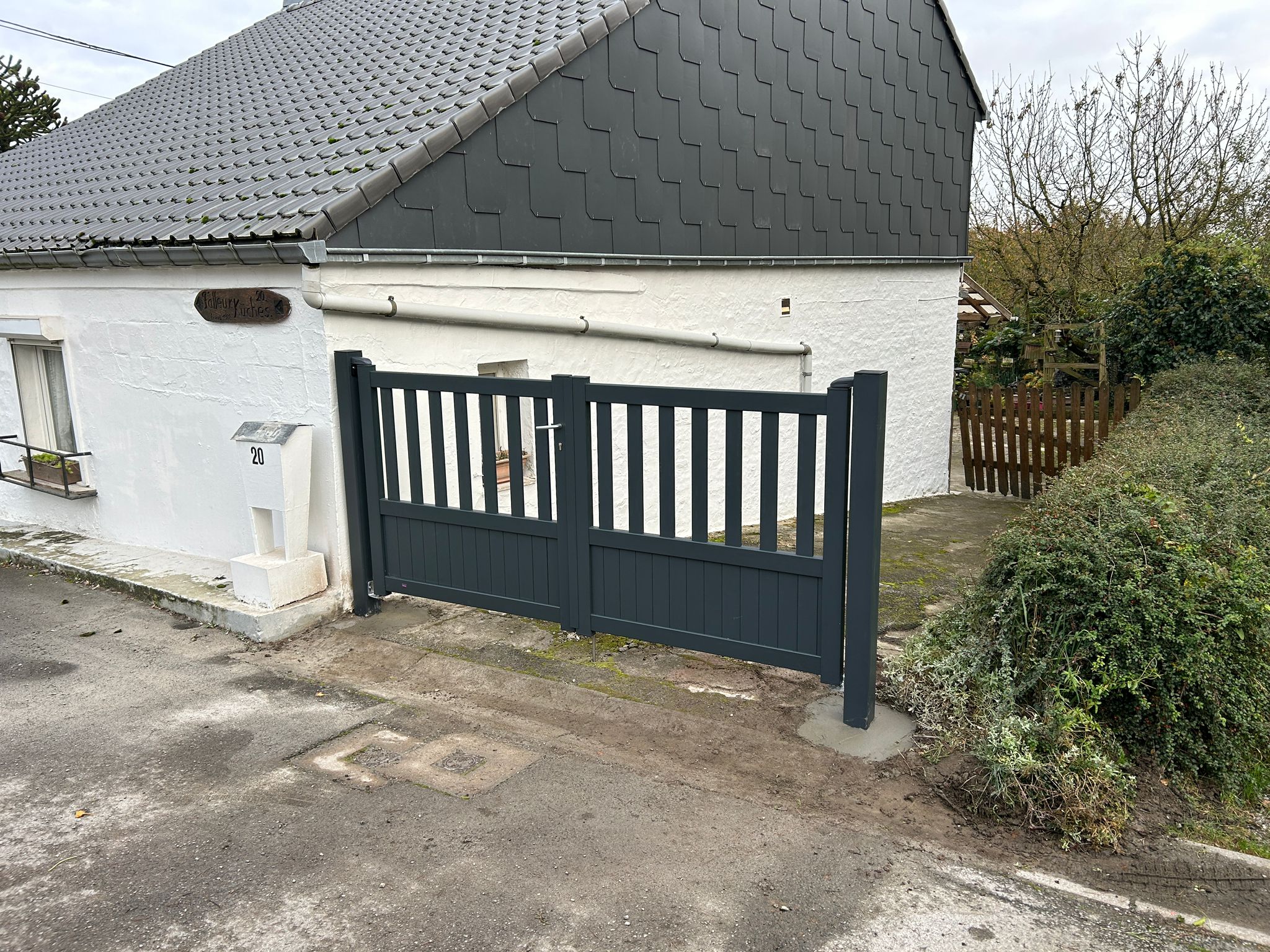 Portail en aluminium gris, avec battant